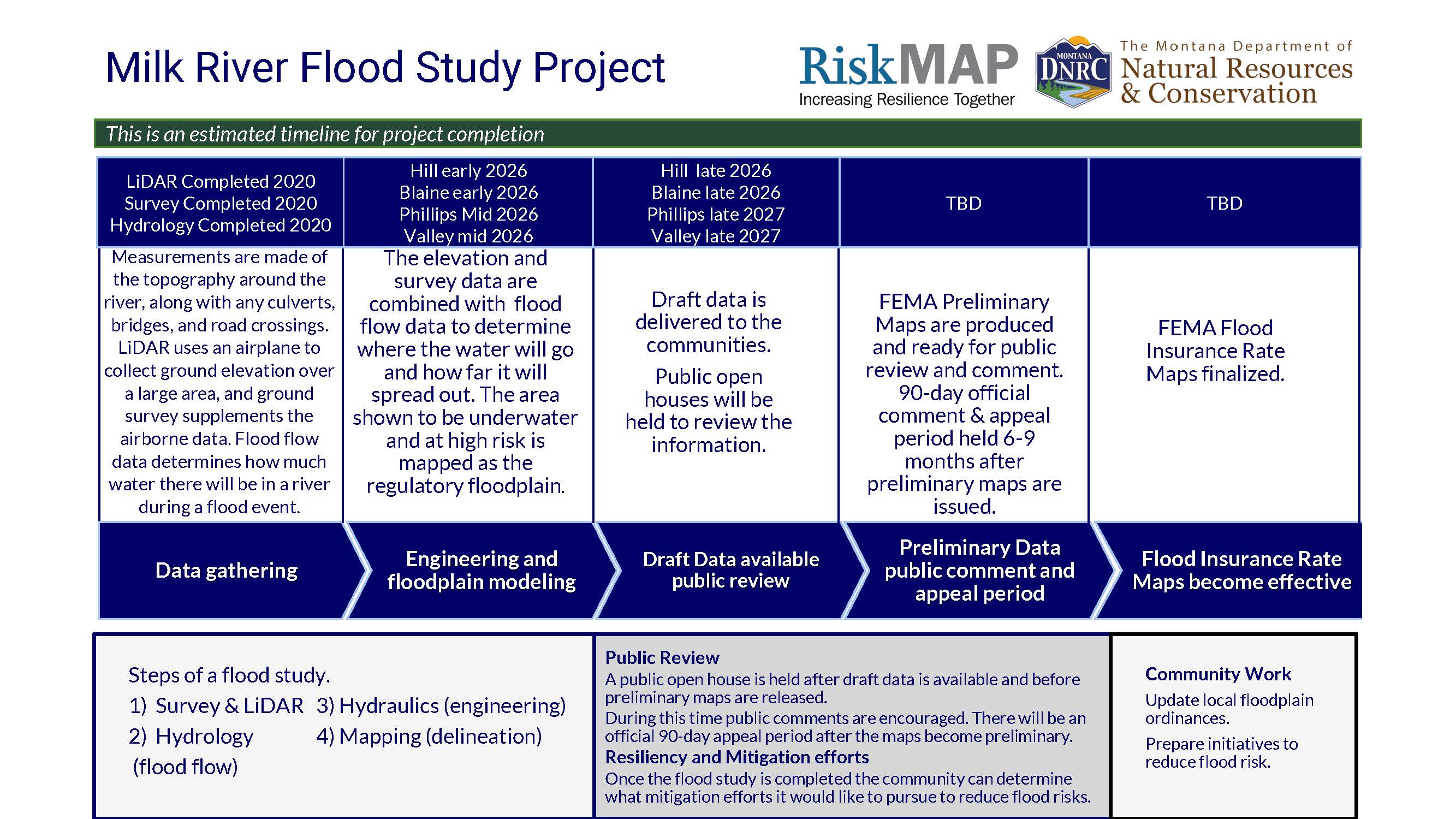 The Milk River communities have been working with the Federal Emergency Management Agency (FEMA) and Montana Department of Natural Resources and Conservation (DNRC) to produce new and updated 1% annual chance (100-year) floodplain maps. The project includes updating all the existing mapped floodplains in Hill, Blaine, Phillips, and Valley Counties.